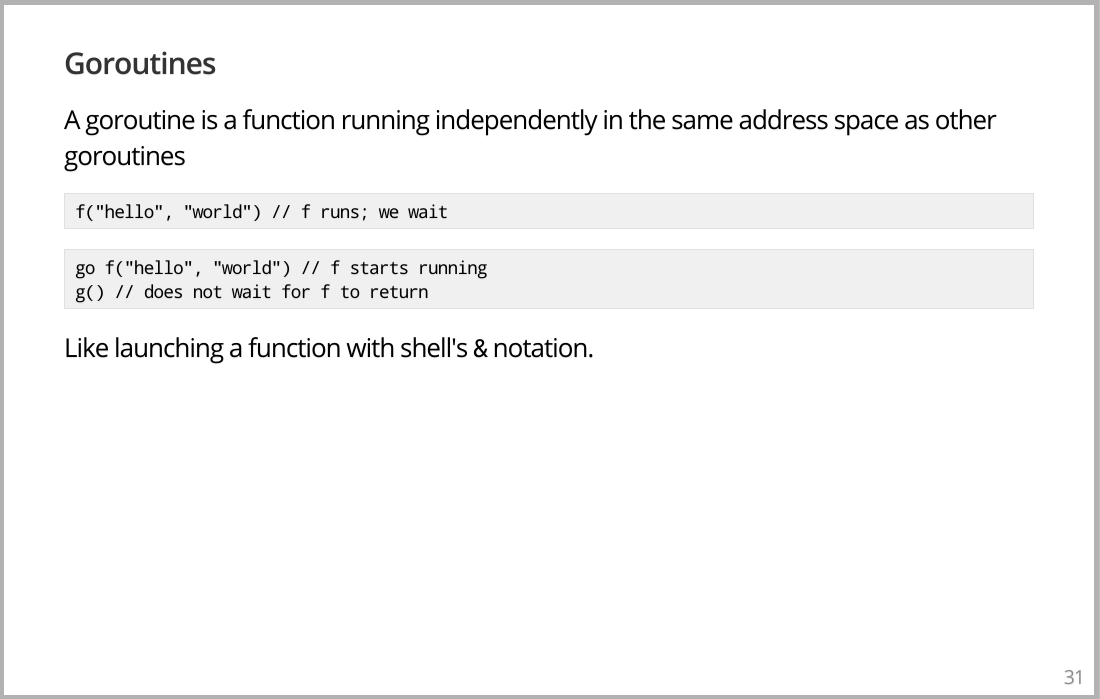 Go 有叫做 goroutine 的东西,可以认为有点像线程,但实际上是不同的。与其详细地谈有什么不同,不如说说它是什么吧。假设我们有一个函数,函数有两个参数。如果在程序中调用该函数 F,则在执行下一条语句之前要等待该函数完成。很熟悉,大家都知道。但是,如果在调用该函数之前放置关键字 go。你调用该函数,函数开始运行,虽然不一,至少在概念上可以立即继续运行。想想并发与并行,从概念上讲,当 F 不在时,程序一直在运行,你在做 F 的事情,不用等 F 回来。如果你觉得很困惑,那就把它想象成一个很像 shell 里的 & 符号。这就像在后台运行 F &,确切地说是一个 goroutine。
