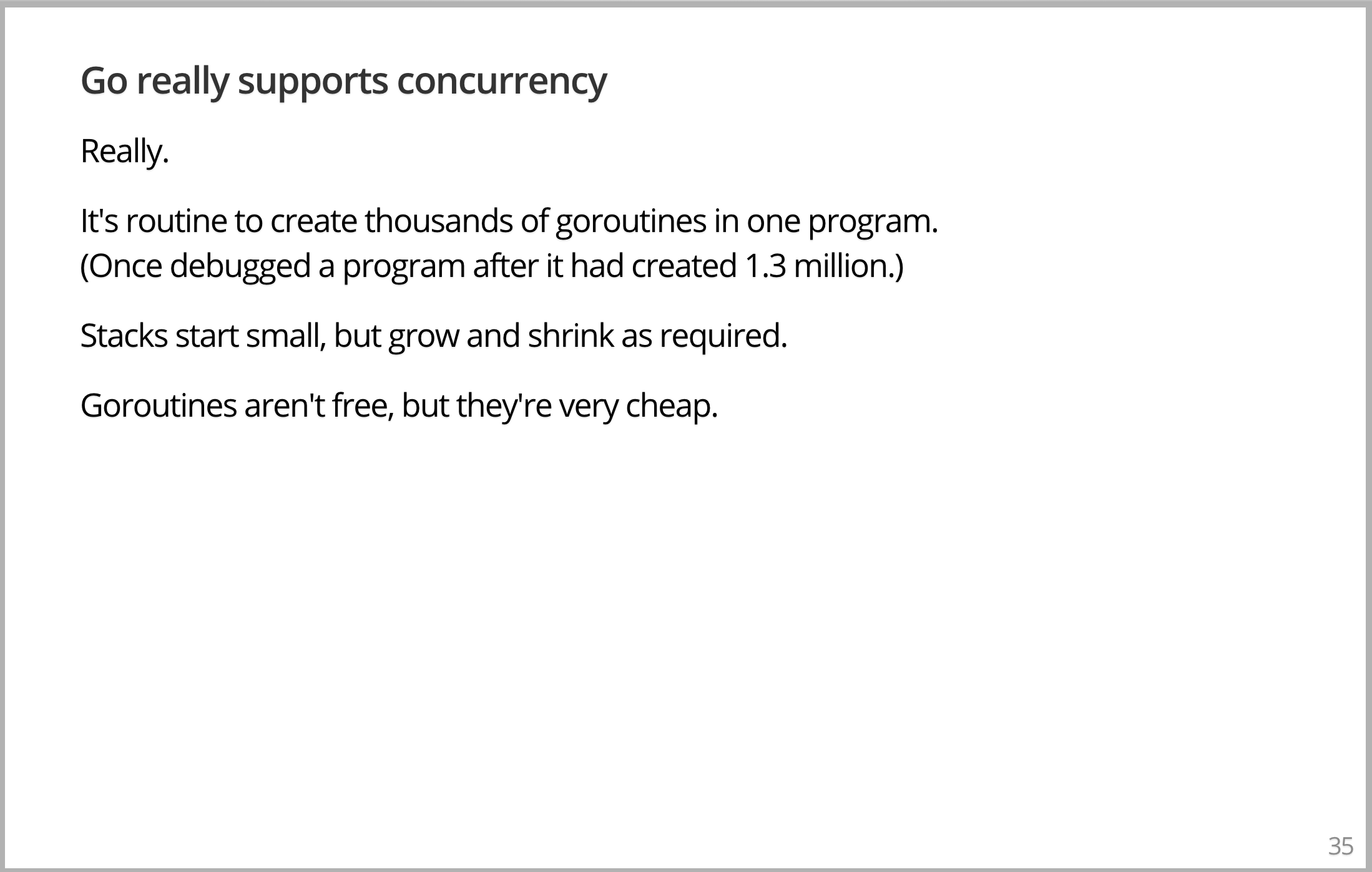 当我说 Go 支持并发,是说它确实支持并发,在 Go 程序中创建数千个 goroutine 是常规操作。我们曾经在会议现场调试一个go程序,它运行在生产环境,已经创建了130万个 goroutine,并且在调试它的时候,有1万个活跃的。当然,要做到如此,goroutine 必须比线程廉价得多,这是重点。goroutine 不是免费的,涉及到内存分配,但不多。它们根据需要增长和缩小,而且管理得很好。它们非常廉价,你可以认为和 Gopher 一样廉价。