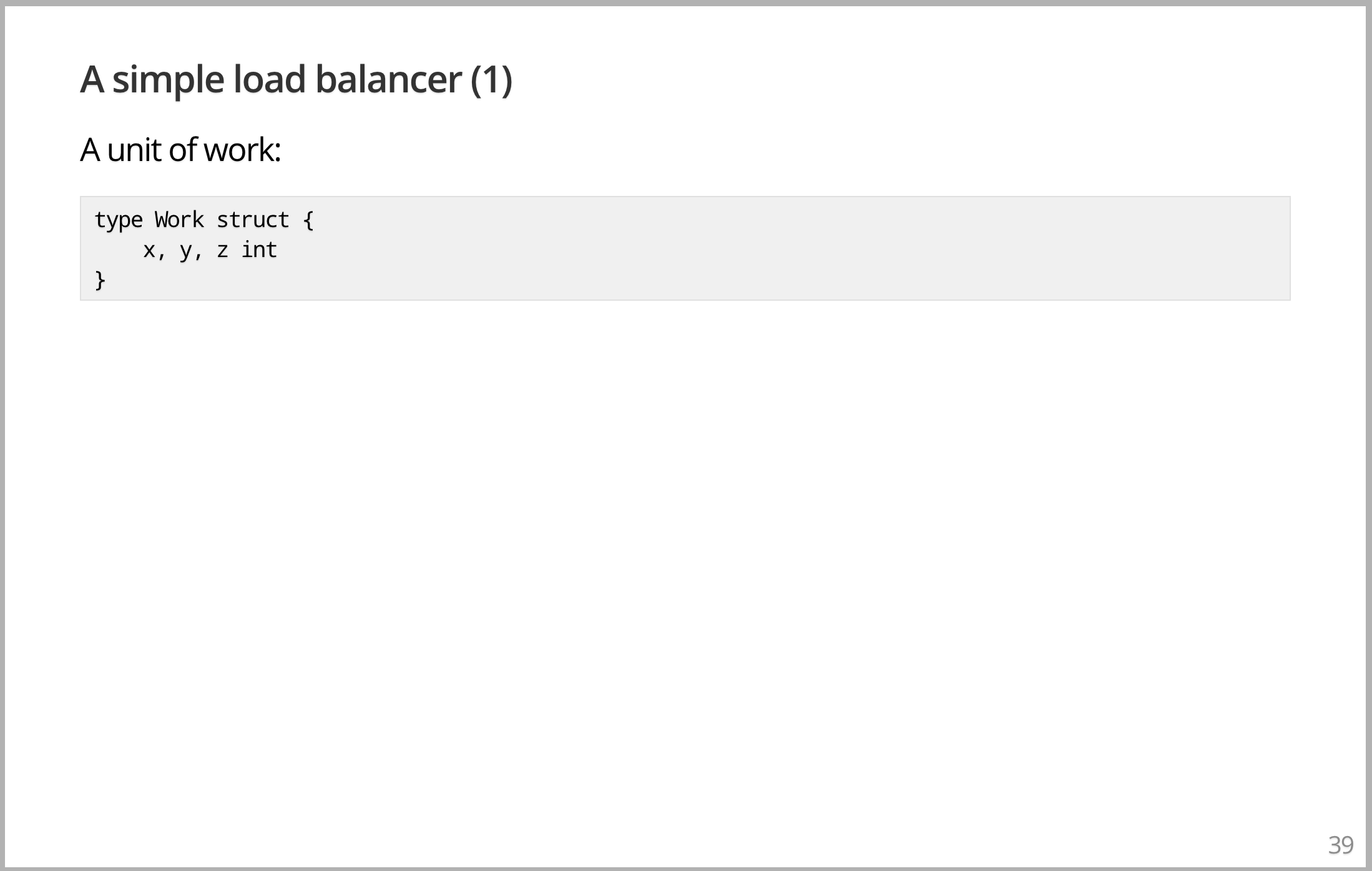 Load Balancer。如果有时间的话,我会给你看另一个例子。这个例子很简单,想象一下你有一大堆工作要完成。我们将它们抽象出来,将它们具体化为一个包含三个整数值的