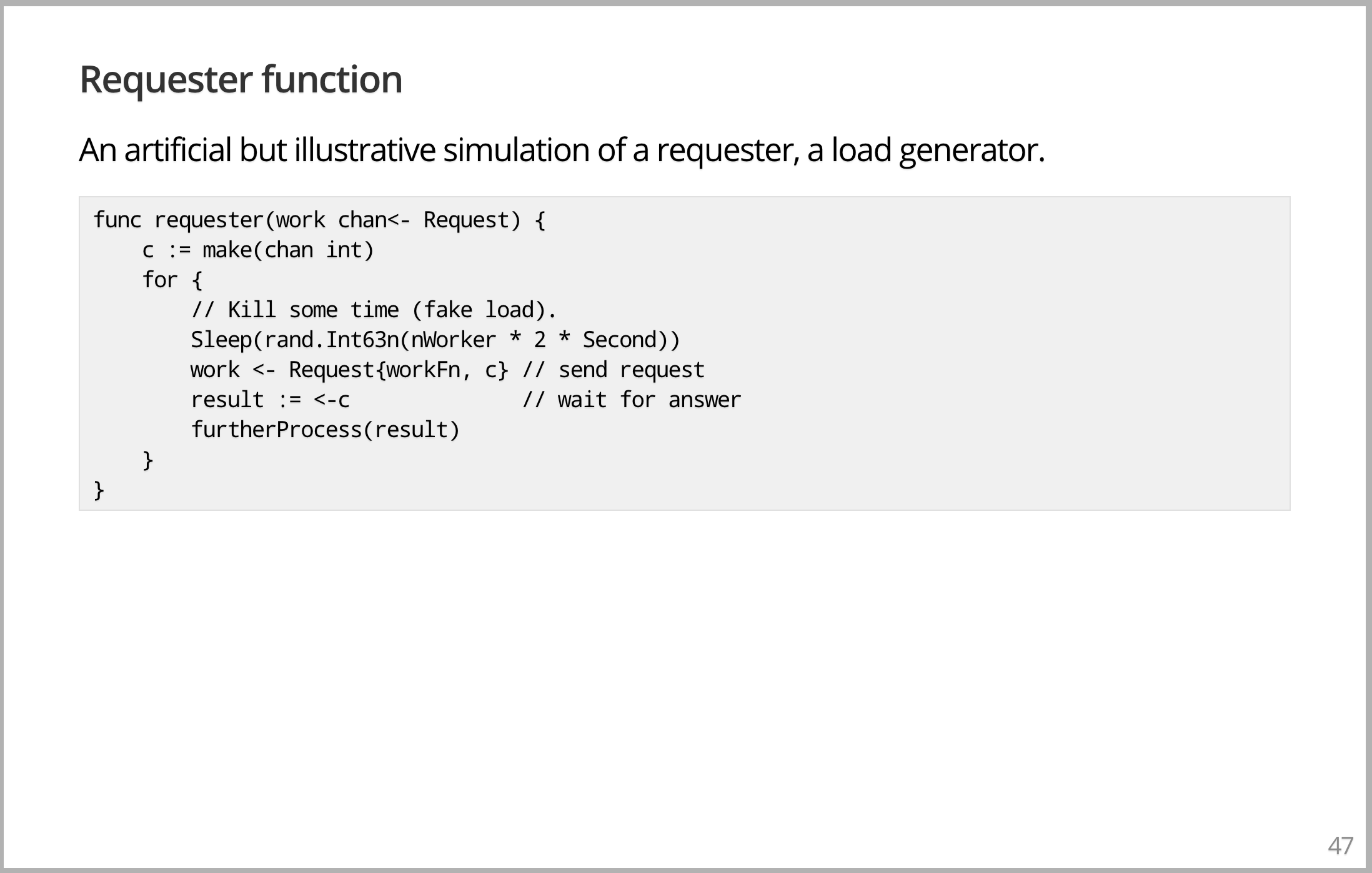 work channel 上发送一个带有用于计算的函数的请求对象,不管是什么,我不在乎;还有一个把答案发回去的 channel;然后你在那个 channel 等待结果返回。一旦你得到结果,你可能得对结果做些什么。这段代码只是按照一定速度生成工作。它只是产生结果,但是通过使用 input 和 output channel 通信来实现的。