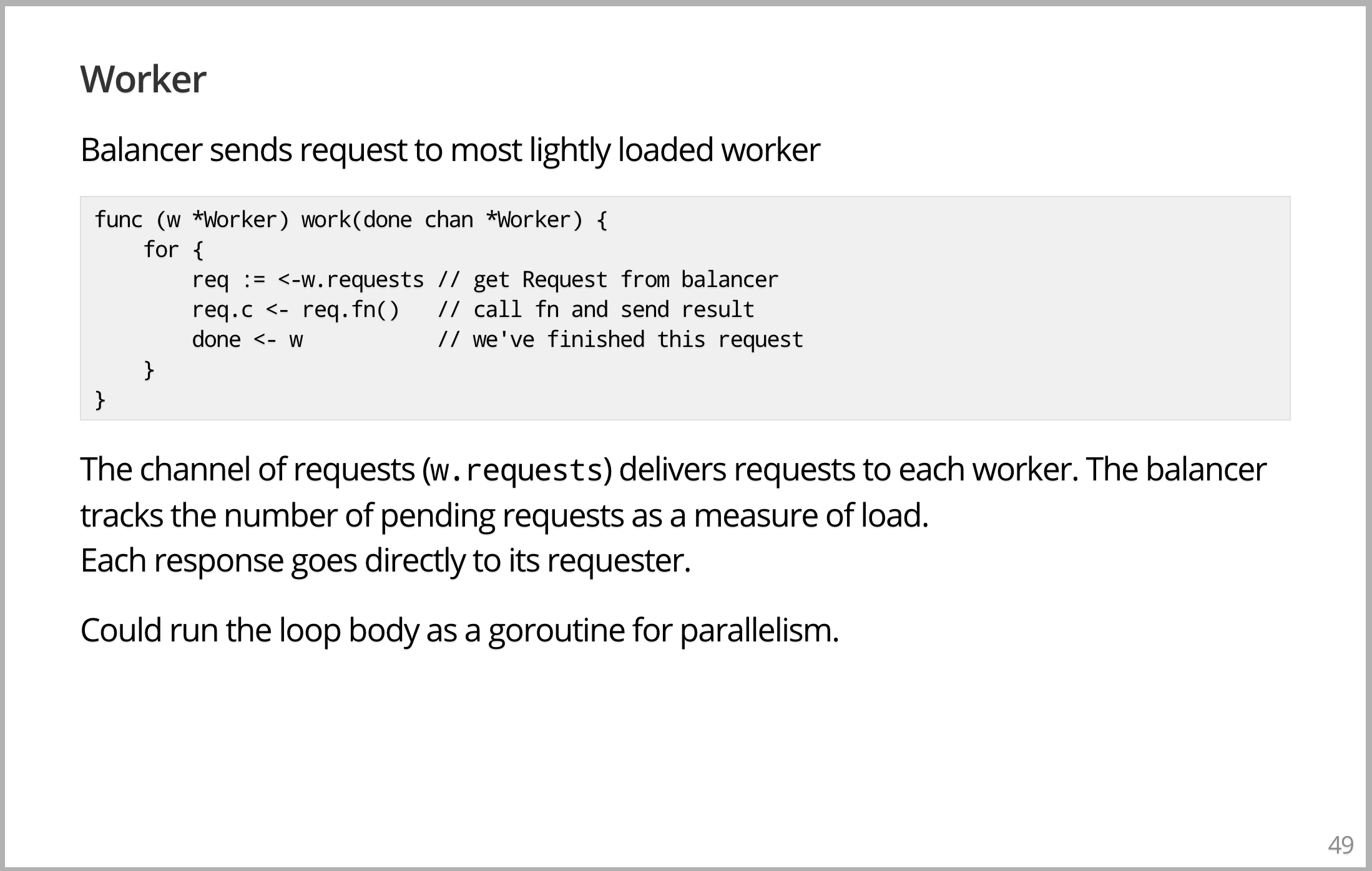 Worker 计算答案,然后在 channel 上返回答案。请注意,与许多其他负载均衡架构不同,从