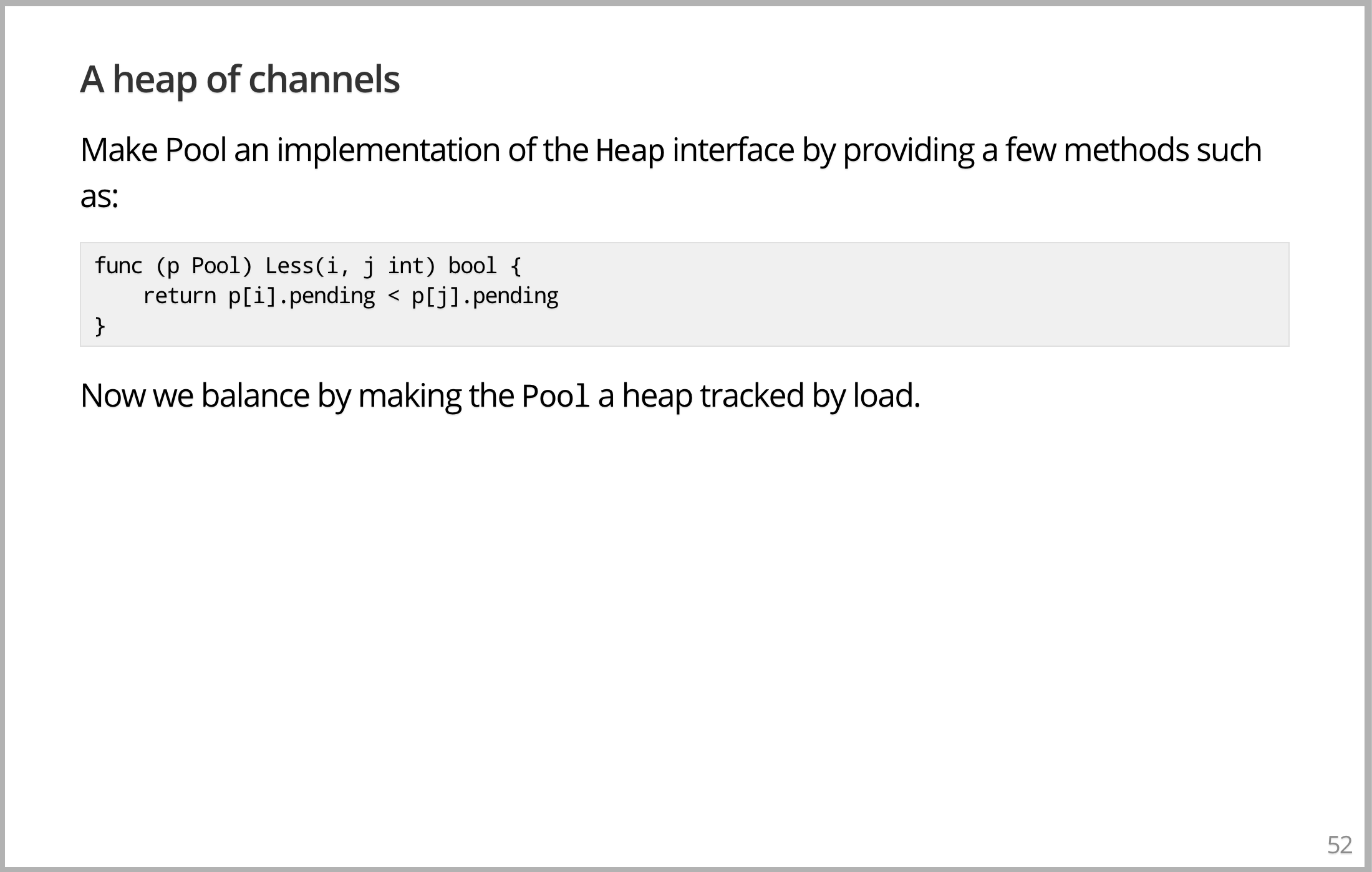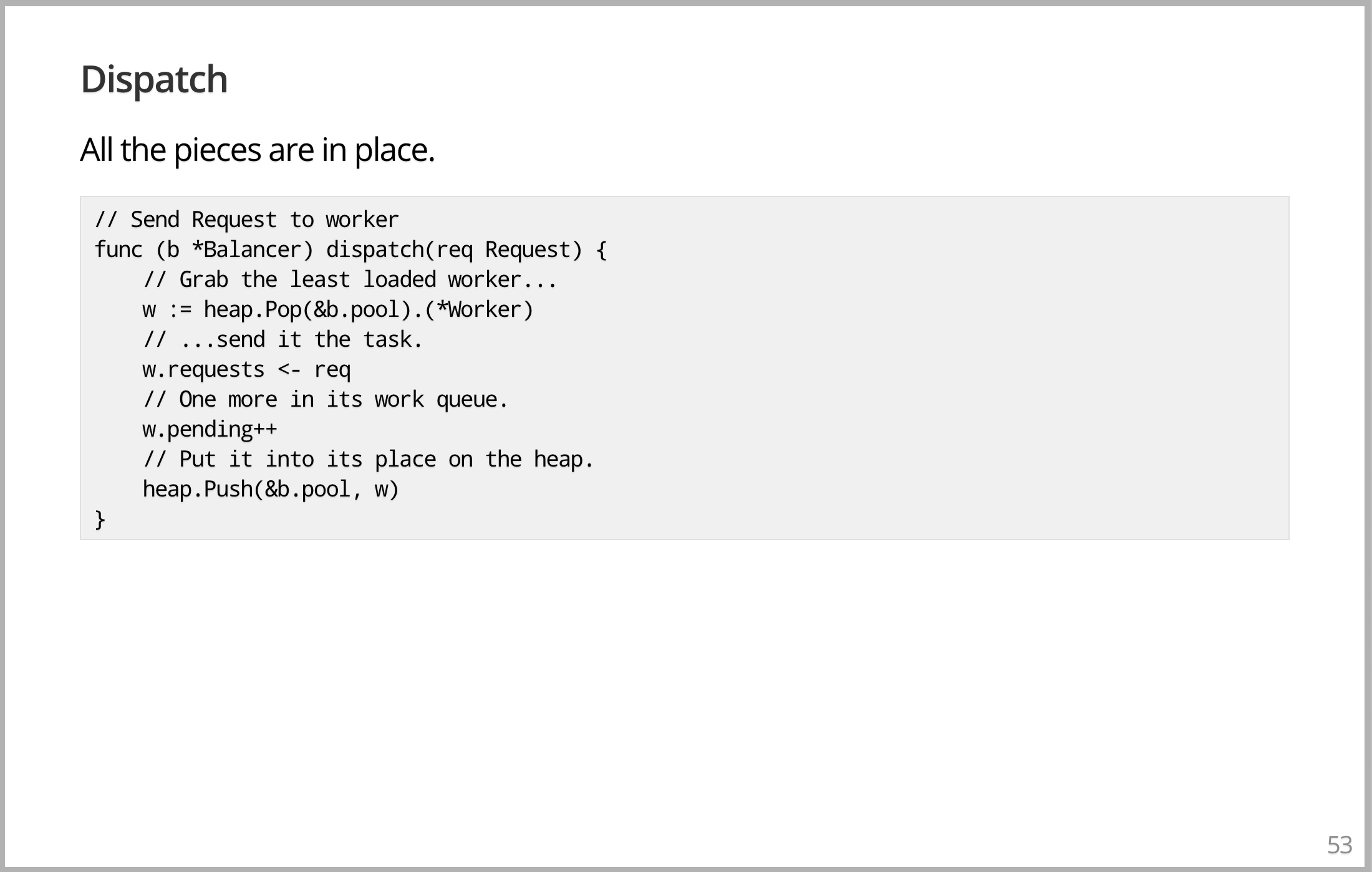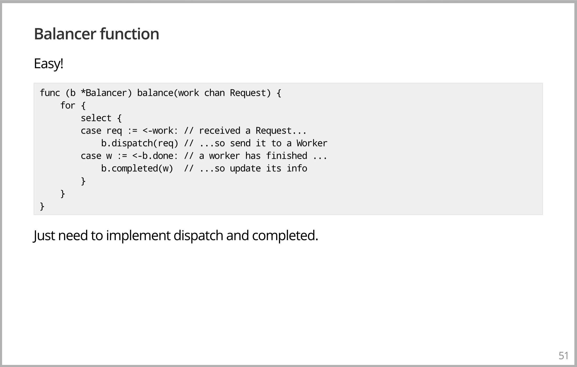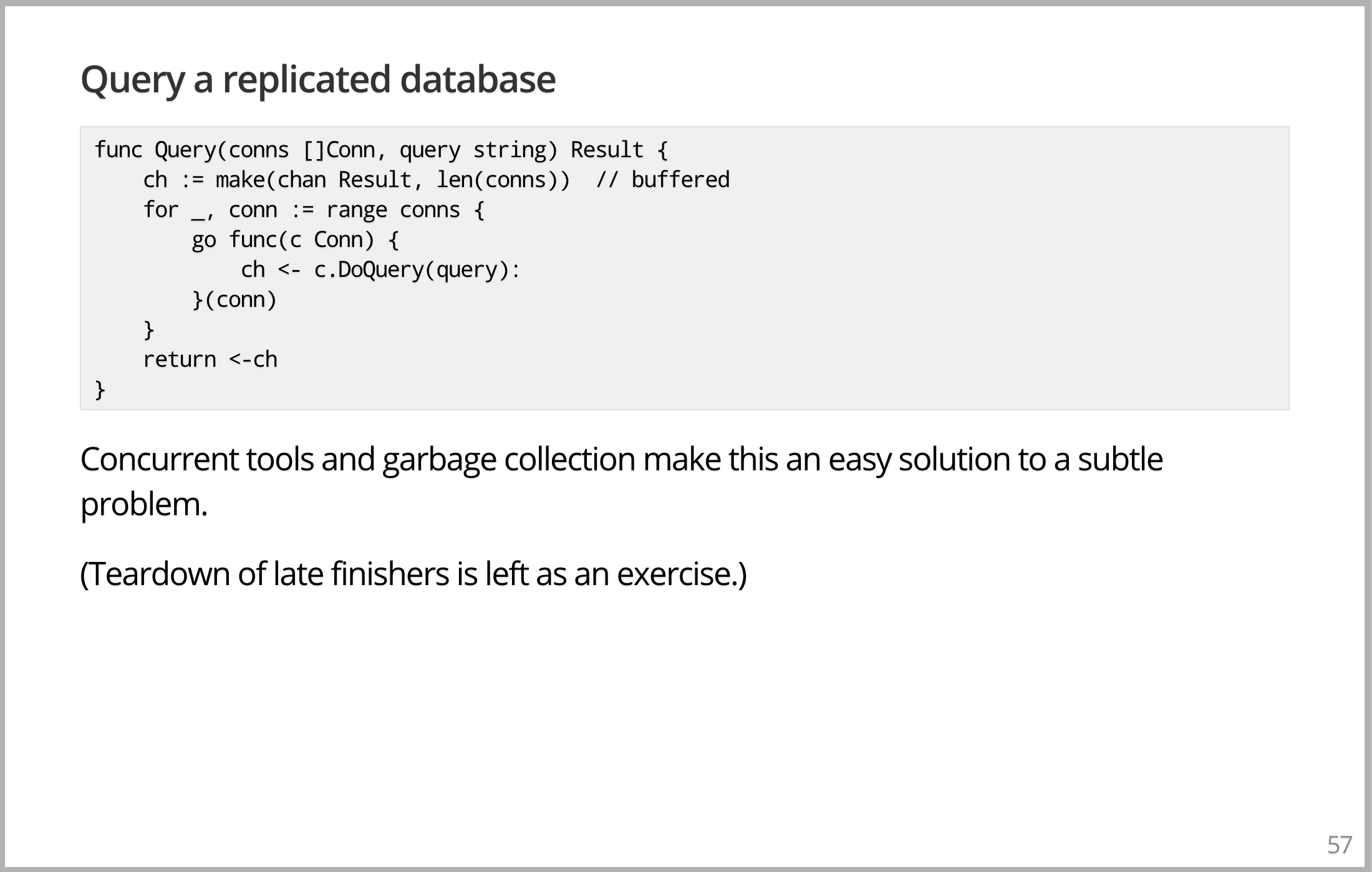 想象一下如何复制数据库,你得到了几个数据库,每个数据库中有相同的数据,谷歌称之为分片,称呼相同的实例。您要做的是向所有数据库传递一个请求,一个查询,并返回结果。结果会是一样的,你选择第一个应答请求来加快速度,因为首先要回来的是你想要的答案。如果其中一个坏了,断开了或者什么的,你不在乎。因为会有其他响应回来,这就是如何做到这一点。这就是它的全部实现。您有一些连接数组和一些要执行的查询,您创建一个 channel,该 channel 缓冲查询数据库中的元素数、副本内的副本数大小的内容,然后您只需在数据库的所有连接上执行。对于其中的每一个,您启动一个 goroutine 以将查询传递到该数据库,然后获取答案。但是通过这个 DoQuery 调用,将答案传递到唯一的 channel,这个 channel 保存所有请求的结果。然后,在你执行之后,所有的 goroutine 都只需在底部这行等待。我们等待第一个回到 channel 的请求,就是你想要的答案。返回它,就完成了。这看起来像个玩具,而且有点像。但这实际上是一个完全正确的实现,唯一缺少的是干净的回收。你想告诉那些还没回来的服务器关闭。当你已经得到答案,不再需要它们。你可以做,增加更多且合理的代码,但那就不适合放在幻灯片上了。所以我只想告诉你,在很多系统中,这是一个相当复杂的问题,但在这里,它只是自然地脱离了架构。因为你已经有了并发工具来表示一个相当大的复杂的分布式问题,它运行得非常好。