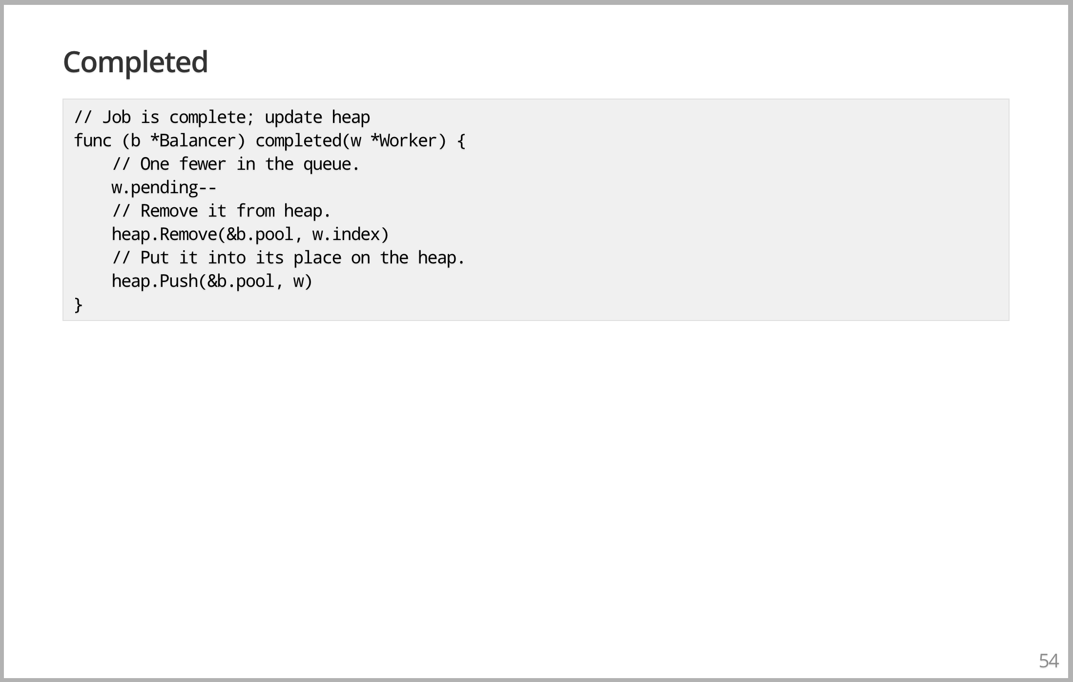 Worker 从堆里取出来,通过将请求写入 request channel 来发送任务。因为增加了一个任务,需要增加负载,这会影响负载分布。然后你把它放回堆的同一个地方,就这样。你刚刚调度了它,并且在结构上进行了更新,这就是可执行代码行的内容。