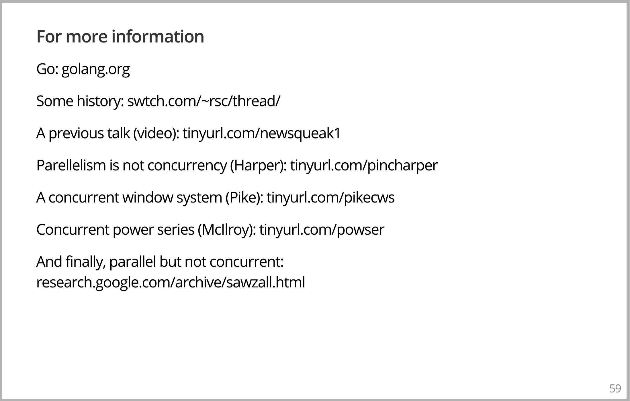 golang.org 有关于 GO 你想知道的一切。有一份很好的历史 paper,链接如上。几年前我做了一个演讲,让我们真正开始开发Go语言,你可能会觉得很有趣。CMU 的 Bob Harper 有一篇非常不错的博客文章,叫做“并行不是并发”,这与“并发不是并行”的观点非常相似,虽然不完全一样。还有一些其他的东西,最令人惊讶的是,道格·马图尔(Doug Mathur),我在贝尔实验室(Bell Labs)的老板,所做的并行幂级数的工作,这是一篇了不起的论文。但如果你想与众不同的话。幻灯片上的最后一个链接是到另一种语言 sawzall,我从贝尔实验室(Bell Labs)来到谷歌后不久做的,这很了不起,因为它是不可思议的并行的语言,但它绝对没有并发性。现在我想你可能明白了这是可能的,所以非常感谢你的倾听和感谢 Hiroko 给我写信。我想是时候喝点什么了。