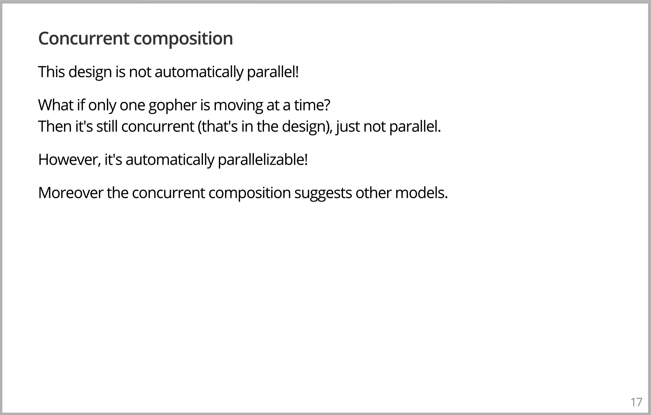 现在这种设计不是自动并行的。确实有两个 Gopher,但是谁说它们必须同时工作呢?我可以说,同时只有一个 Gopher 可以移动,就像单核计算机,此设计仍然是并发的,很好很正确,但它本质上不是并行的,除非让两个 Gopher 同时搬运。当并行出现时,有两个事物同时执行,而不仅仅是拥有两个事物。这是一个非常重要的模型,一旦断定理解了它,我们就会明白可以把问题分解成并发的块。