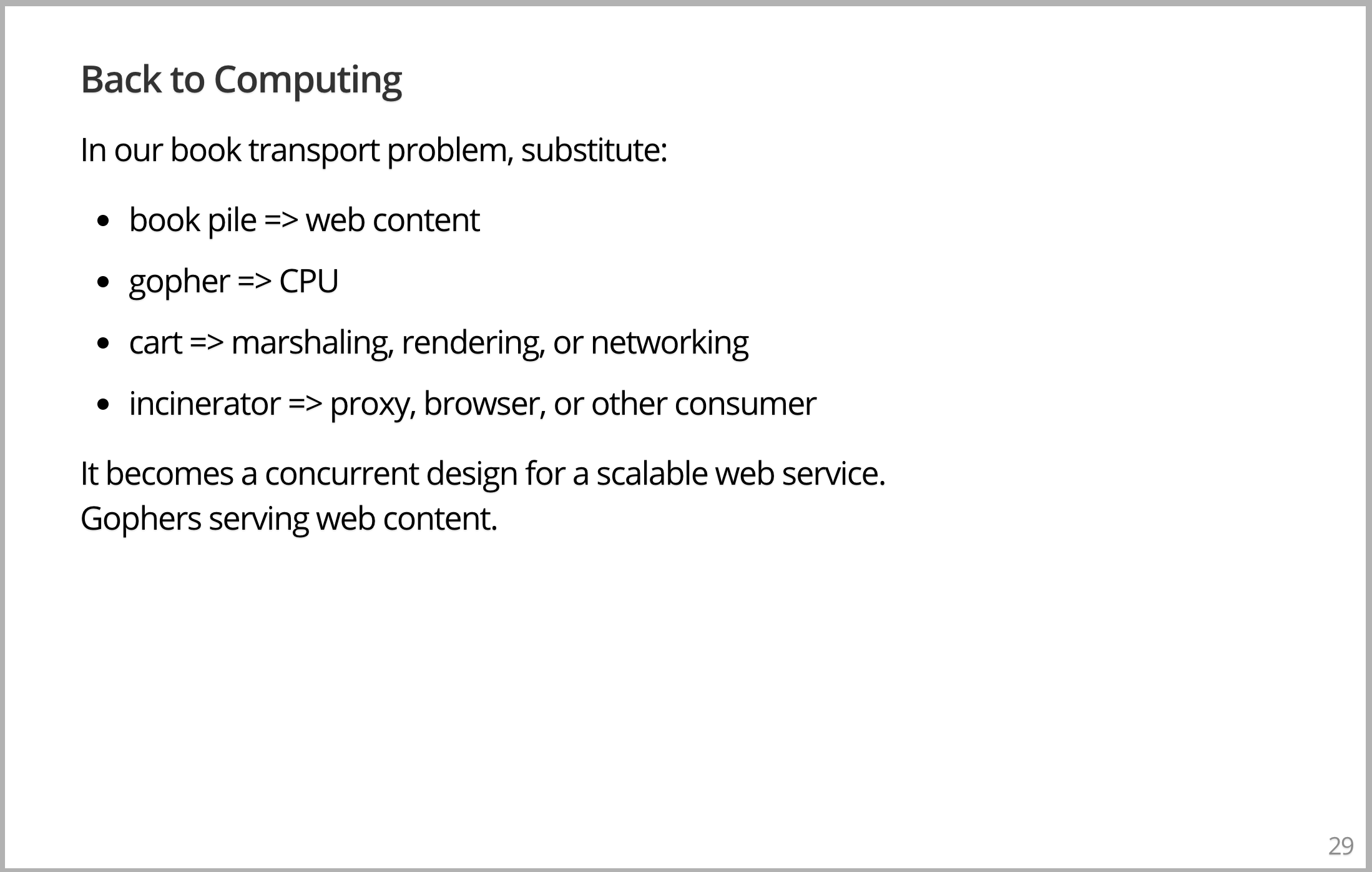 因为如果你拿到这个问题,把书堆换成一些网络内容;把 Gopher 换成 CPU,把推车换成网络或编码代码等等;把问题变成你需要移动数据;焚化炉是网络代理,或是浏览器,你想到的任何的数据使用者。您刚刚构建了一个 Web 服务体系结构的设计。你可能不认为你的 Web 服务架构是这样的,但事实上差不多就是这样。你可以把这两块替换掉看看,这正是你想的那种设计。当你谈论代理、转发代理和缓冲区之类会,扩容更多的实例的东西时,它们都在这个图上,只是不被这么想。本质上并不难理解它们,Gopher 能做到,我们也能。