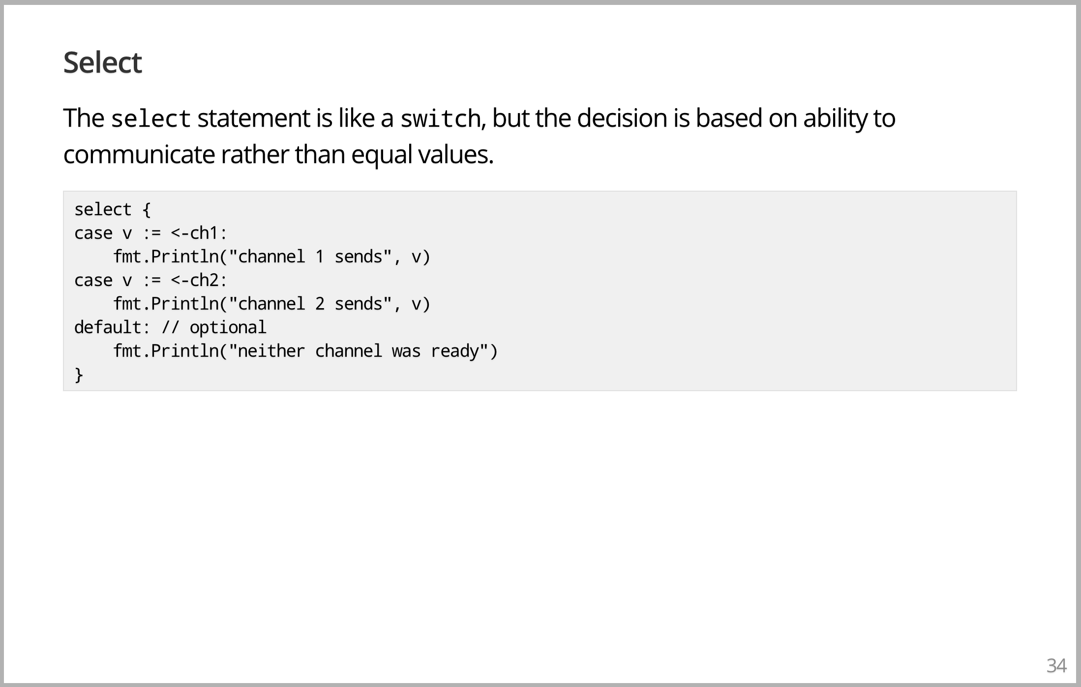 timer channel 接收那个值。该 goroutine 会阻塞直到有一个值被传递过来。一旦完成,它将设置为得到的时间,即其他 goroutine 完成的时间。小例子,但你需要的一切都在那张小幻灯片里。