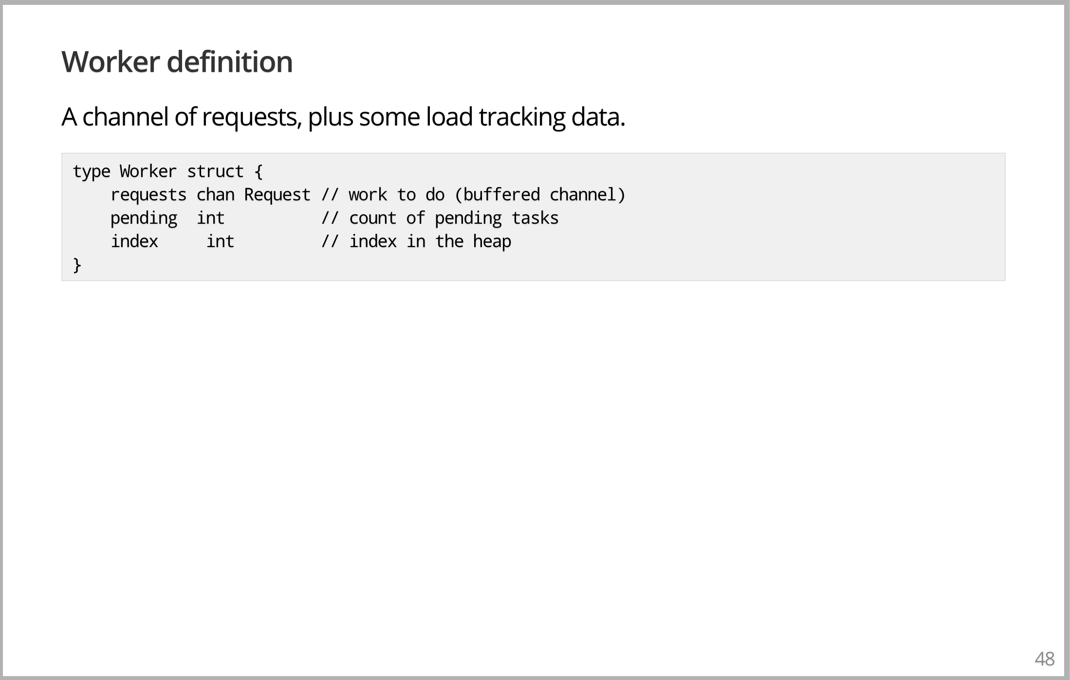 first-class 的东西,使得可以到处传递 channel。它在某种意义上类似于文件描述符,持有 channel 的对象就可以和其他对象通信,但没有 channel 的对象是做不到的。就好像打电话给别人,或者通过文件描述符传递文件一样,是一个相当有影响的概念。想法是,要发送一个需要计算的请求,它包含一个计算完成返回结果的 channel。