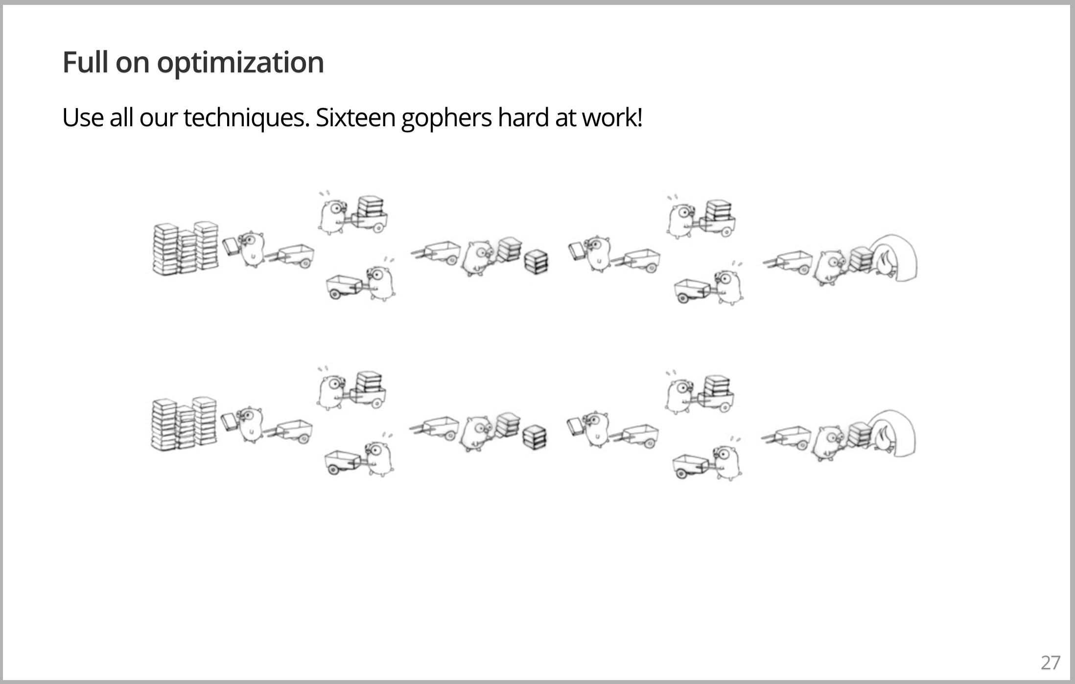 但这样还不够好,因为我们可以在另一个维度并行,运力全开。此时,有16个 Gopher 将这些书搬运到焚化炉中。显然,增加 Gopher 使问题解决的更好,是非常简单和愚蠢的。但我希望您了解,从概念上讲,这真的就是您考虑并行运行事物的方式。您无需考虑并行运行,而是考虑如何将问题以可分解、可理解、可操作的方式,分解为独立的块,然后组合起来以解决整个问题。
