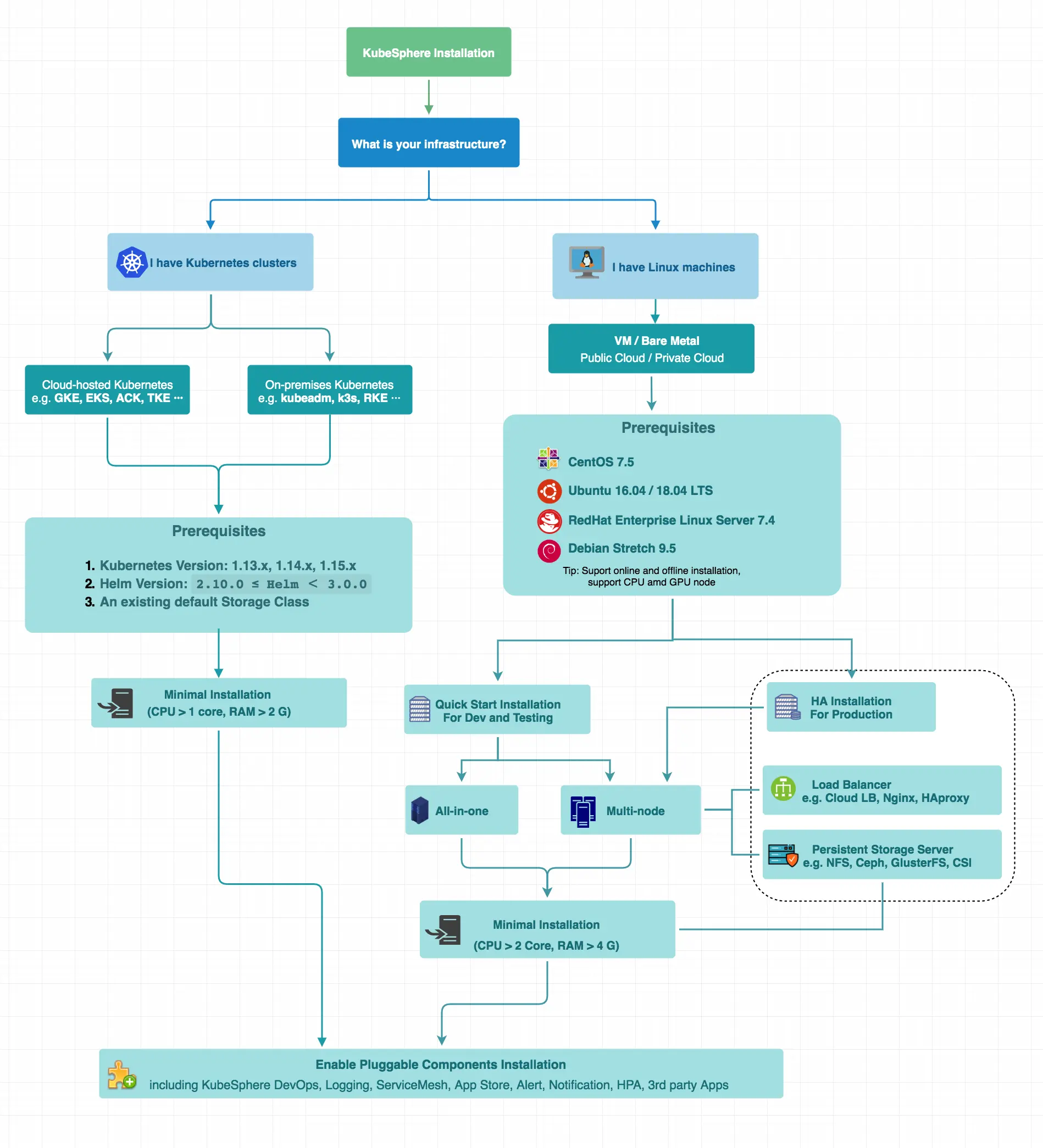 - KubeSphere 2.1 默认仅开启最小化安装,Installer 已支持自定义安装各个可插拔的功能组件,用户可根据业务需求和机器配置选择安装所需的组件,请确保开启可插拔组件之前机器资源满足最低要求,参考开启可选组件的安装。