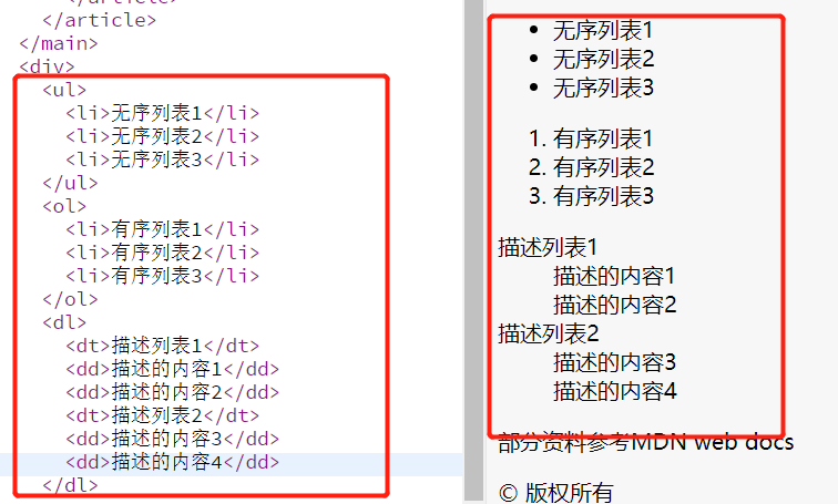 <a>元素(或称锚元素)可以创建通向其他网页、文件、同一页面内的位置、电子邮件地址或任何其他 URL 的超链接。<strong>表示文本十分重要,一般用粗体显示<em>标记出需要用户着重阅读的内容,<em>元素是可以嵌套的,嵌套层次越深,则其包含的内容被认定为越需要着重阅读<pre>保留里面的所有空格,回车,tab,默认样式不管几个都会缩成一个<code>写代码用的,配合pre可以跟软件写的样式一样<br>表示换行<hr>表示水平分割线- 列表如下图演示