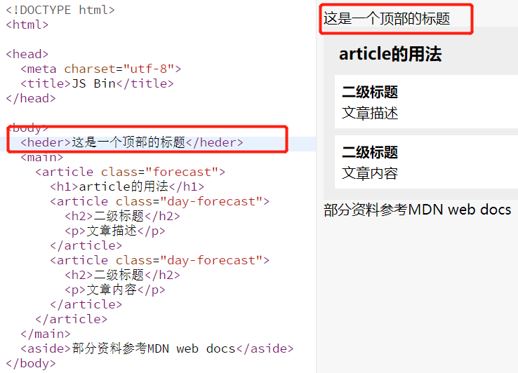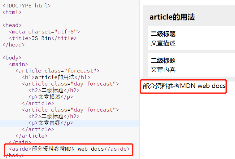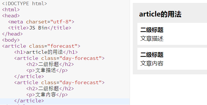 article元素表示文档、页面、应用或网站中的独立结构,其意在成为可独立分配的或可复用的结构,如在发布中,它可能是论坛帖子、杂志或新闻文章、博客、用户提交的评论、交互式组件,或者其他独立的内容项目。其中class定义了它的样式