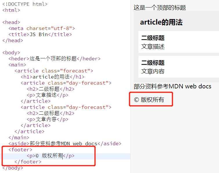 - footer元素表示最近一个章节内容或者根节点(sectioning root )元素的页脚。一个页脚通常包含该章节作者、版权数据或者与文档相关的链接等信息。