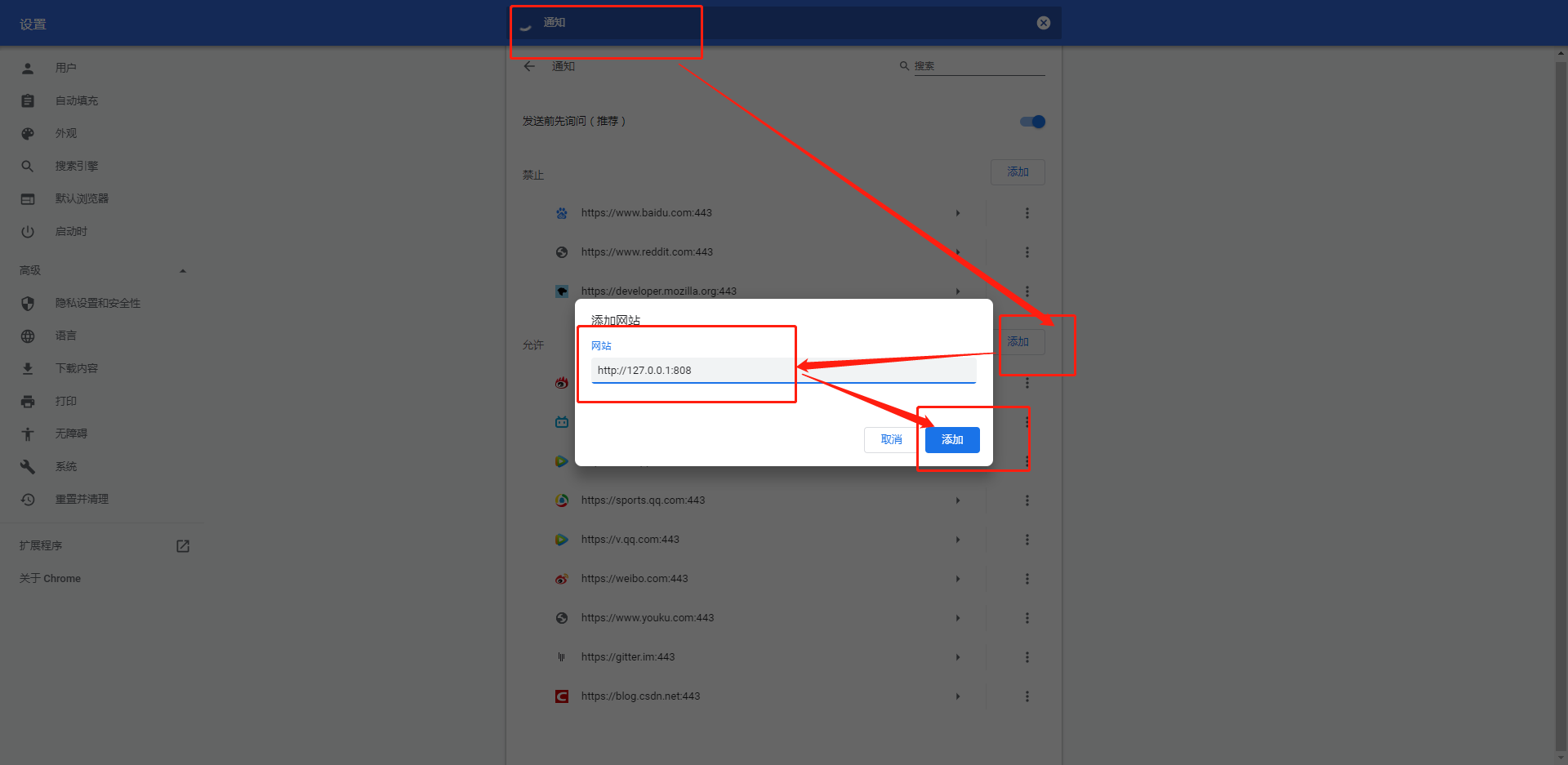 已谷歌为例,在浏览器设置中,开始添加或者开始网站的消息通知。不同的浏览器通知设置的地方不太一样。