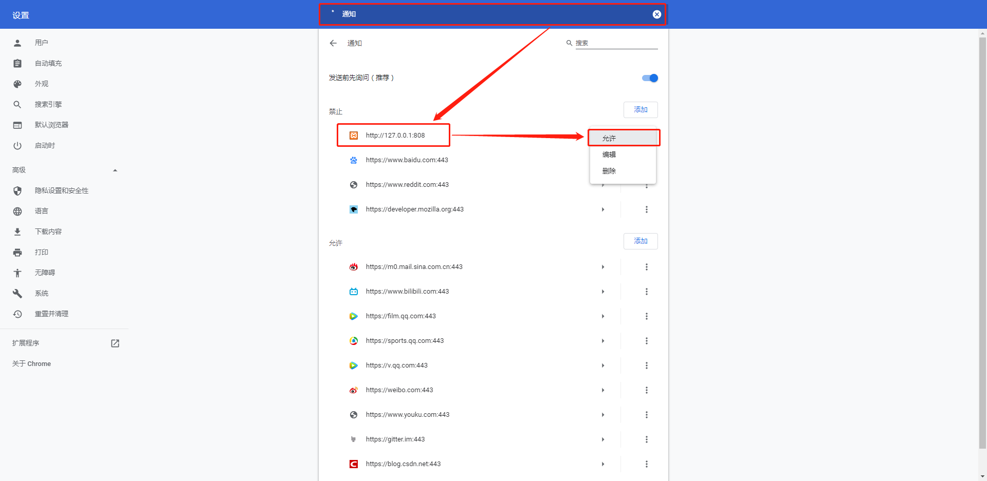 注意:如果之前在域名中禁止消息通知,可以自己手动在开启,Notification是不能在禁止状态下代码设计开启消息通知的。