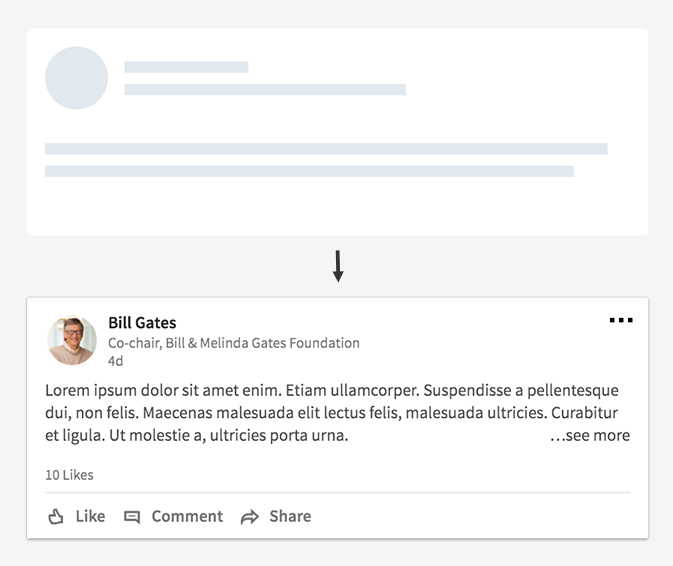 我们平常对于需要请求加载的内容,可能用的比较多的是loading动画,比如在内容区域放一个菊花图,当请求结束,并且render tree构造完成后,将菊花图移除,展示用户想看的内容。虽然这种方式没啥缺点,但是现在更多的网站开始使用骨架屏代替,因为它能带过来更好的用户体验。 我们看几个例子: