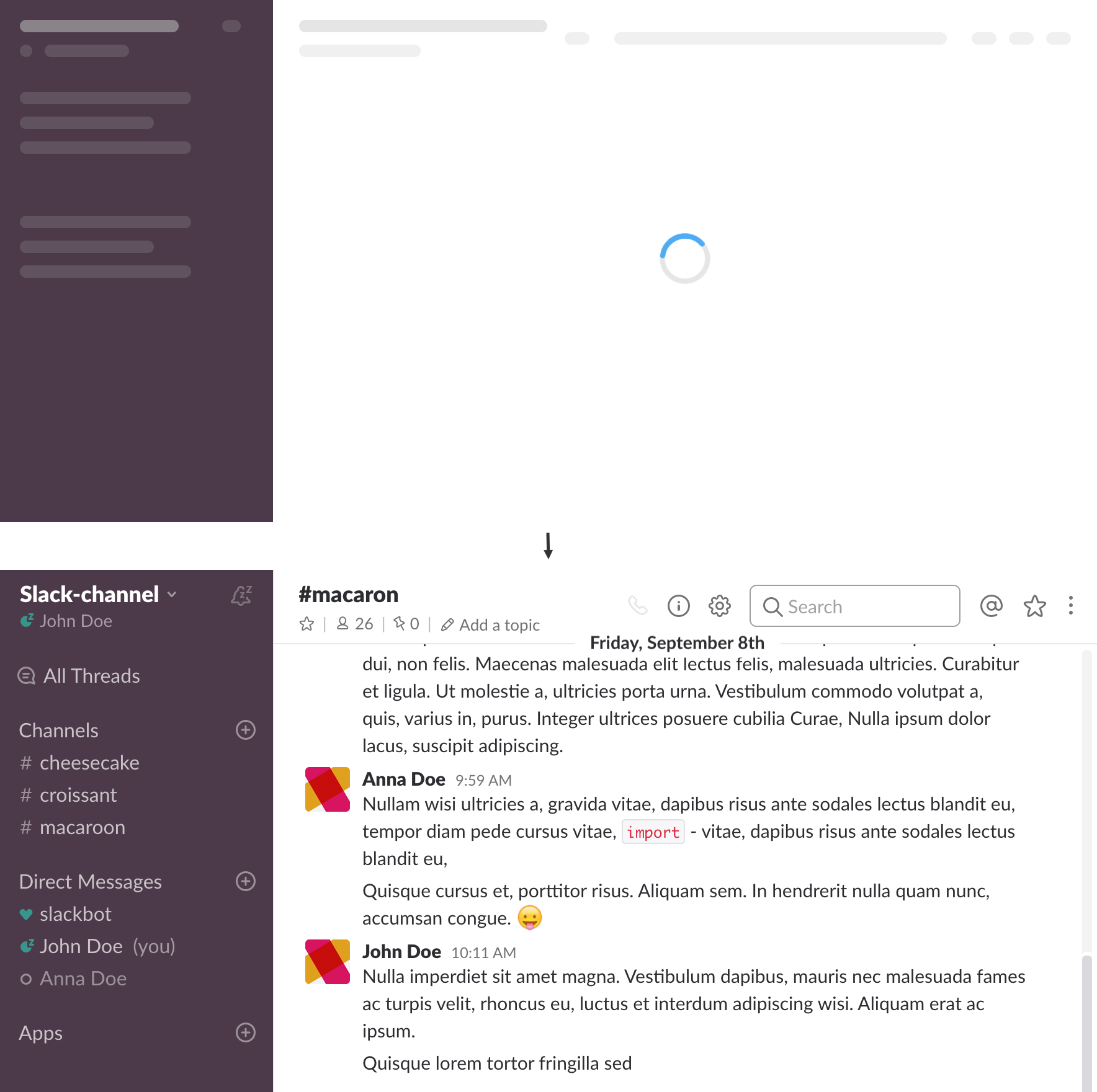 - slack则是使用混合的loading方式,有骨架图也有旋转圆,不仅如此,slack并没有全部使用同一种灰色值,不同的block的颜色代表的该区域的字体颜色,这又是一种切换顺滑度的提升。