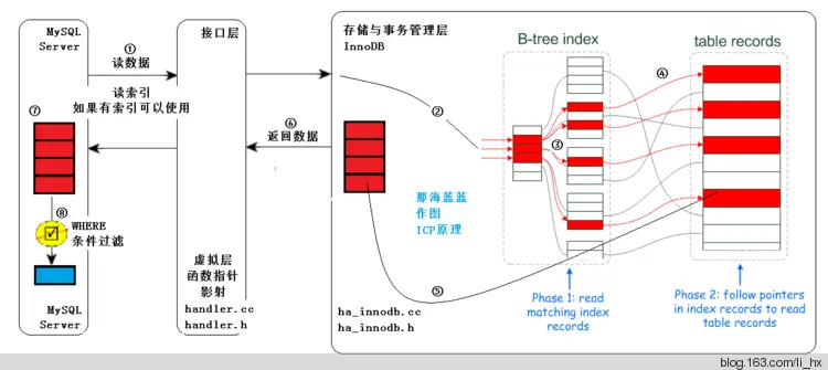 ②、③:进入存储引擎,读取索引树,在索引树上查找,把满足已经下推的条件的(经过查找,红色的满足)从表记录中读出(步骤④,通常有IO),从存储引擎返回⑤标识的结果。