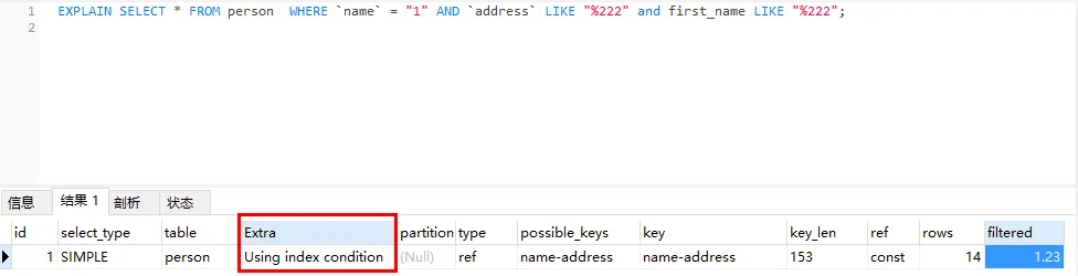 当使用explan进行分析时,如果使用了索引条件下推,Extra会显示Using index condition。并不是Using index因为并不能确定利用索引条件下推查询出的数据就是符合要求的数据,还需要通过其他的查询条件来判断。