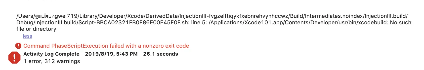 看了一下,报错信息里面有 Xcode101.app,这显然不对啊,应该是 Xcode.app,不然路径肯定不对,然后去 Run Script 里面看到了确实有 Xcode101,如下图