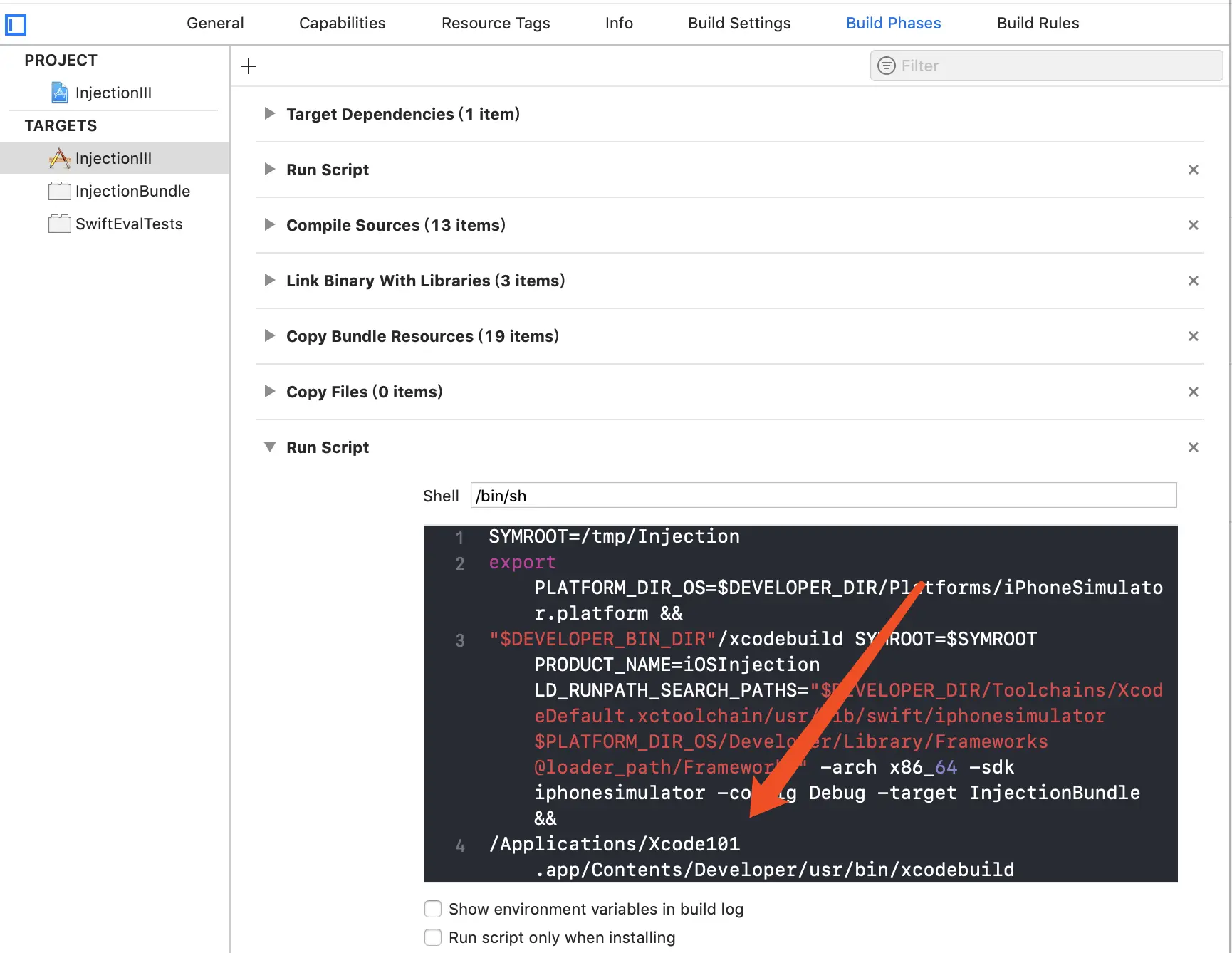 可以看看 InjectionIII Build Phases 下面的 Run Script,从中能找到项目具体对这个 target 做了什么,脚本如下