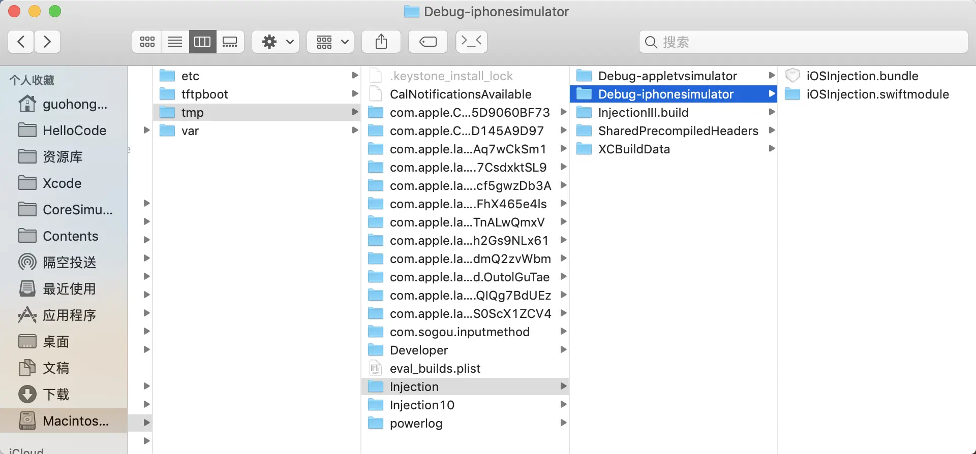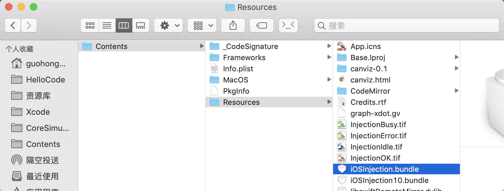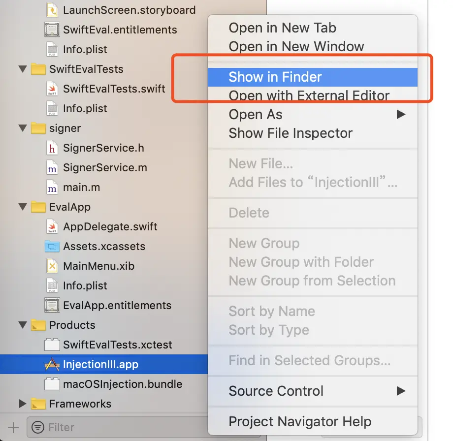 可以在 Products 下选中 InjectionIII.app 然后 Show in Finder,参考我的目录一步一步点进去找到 iOSInjection.bundle。