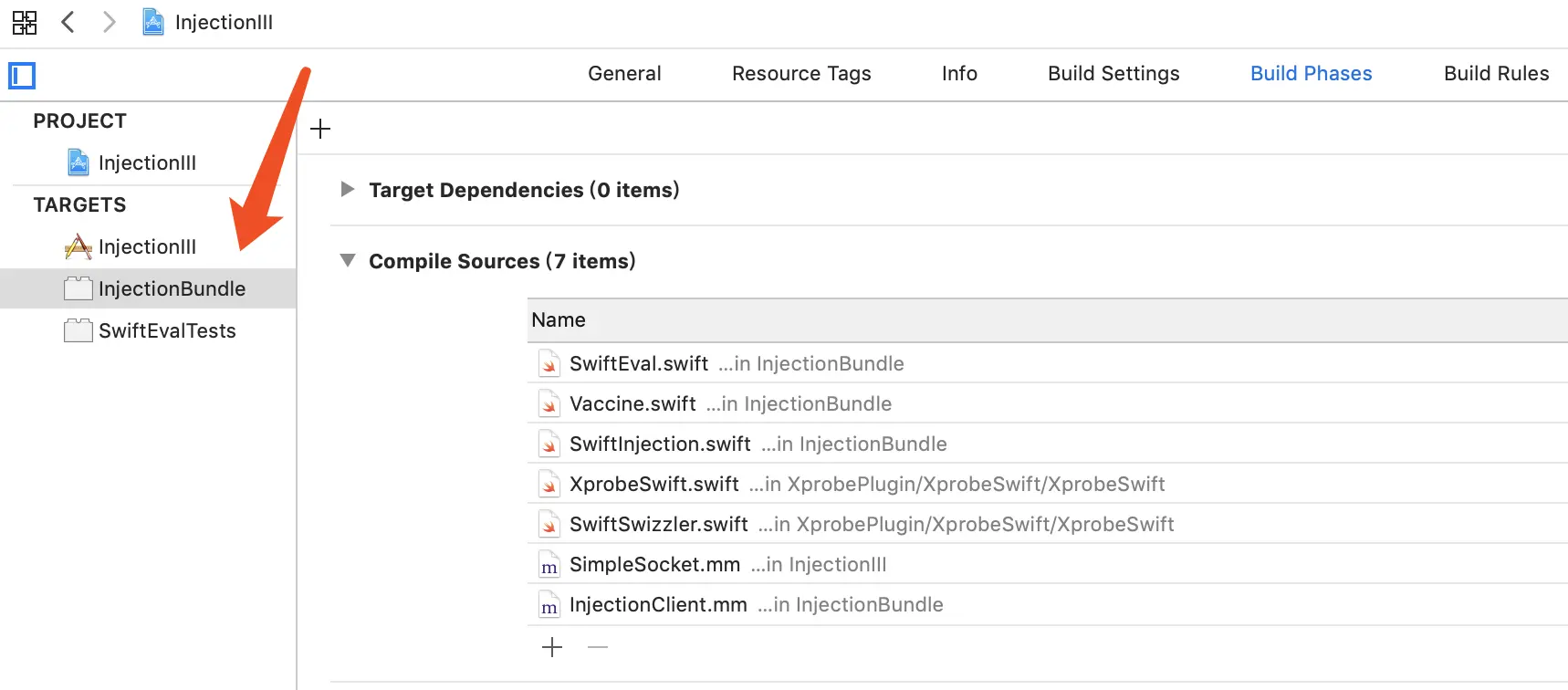 InjectionIII 项目有两个 target,一个 InjectionIII,一个 InjectionBundle。如下图