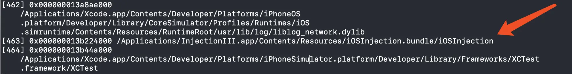 项目启动以后可以在控制台执行 image list -o -f 查看加载的动态库,可以看到 iOSInjection.bundle 确实已经以动态库的形式加载进来了。