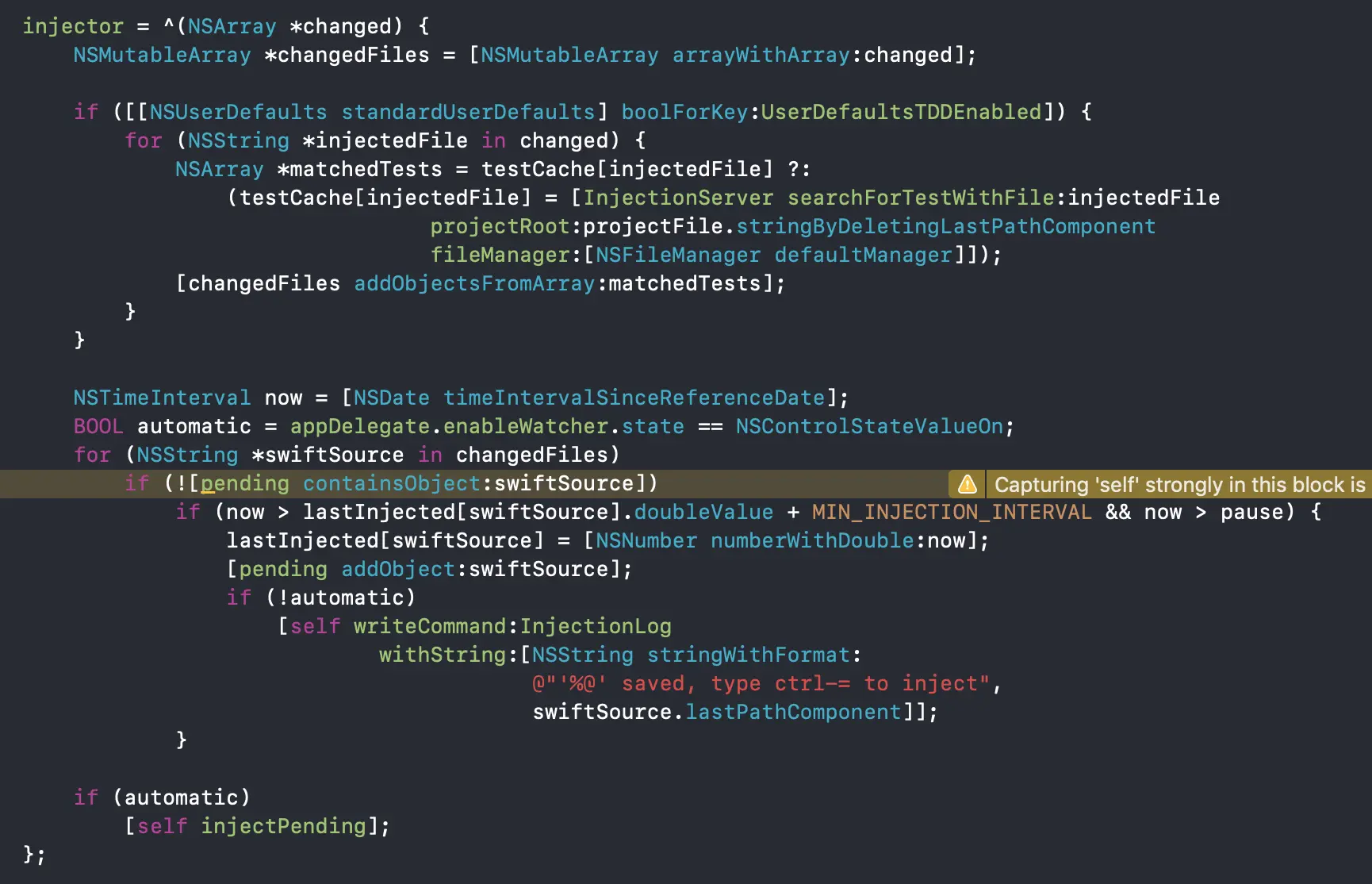 当我们在调试工程中修改了代码并保存后,FileWatcher 会立即收到文件改变的回调,FileWatcher 使用 Mac OS 上的 FSEvents 框架实现,并执行如下图的 injector block 方法。