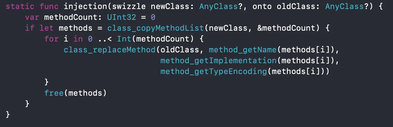 方法的替换 在拿到新类的符号地址后,我们把新类里所有的类方法和实例方法都替换到对应的旧类中,使用的是SwiftInjection 的 injection 方法,具体实现如下图: