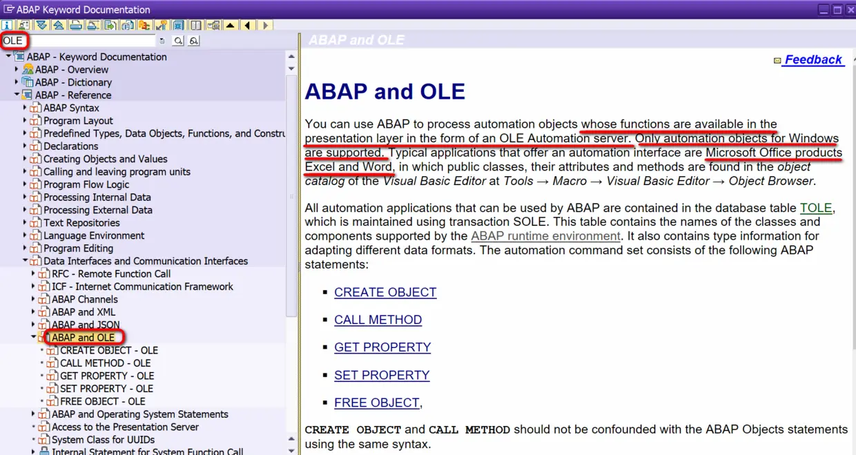 在SAPGUI里根据关键字OLE搜索,能找到通过ABAP操作Excel的一种办法: