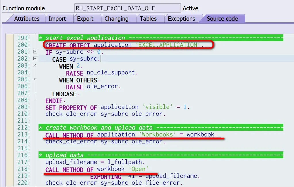 上面这个函数RH_START_EXCEL_DATA_OLE调用微软Excel的automation接口,新建一个Excel workbook,然后准备把ABAP内表里的数据写到Excel里。