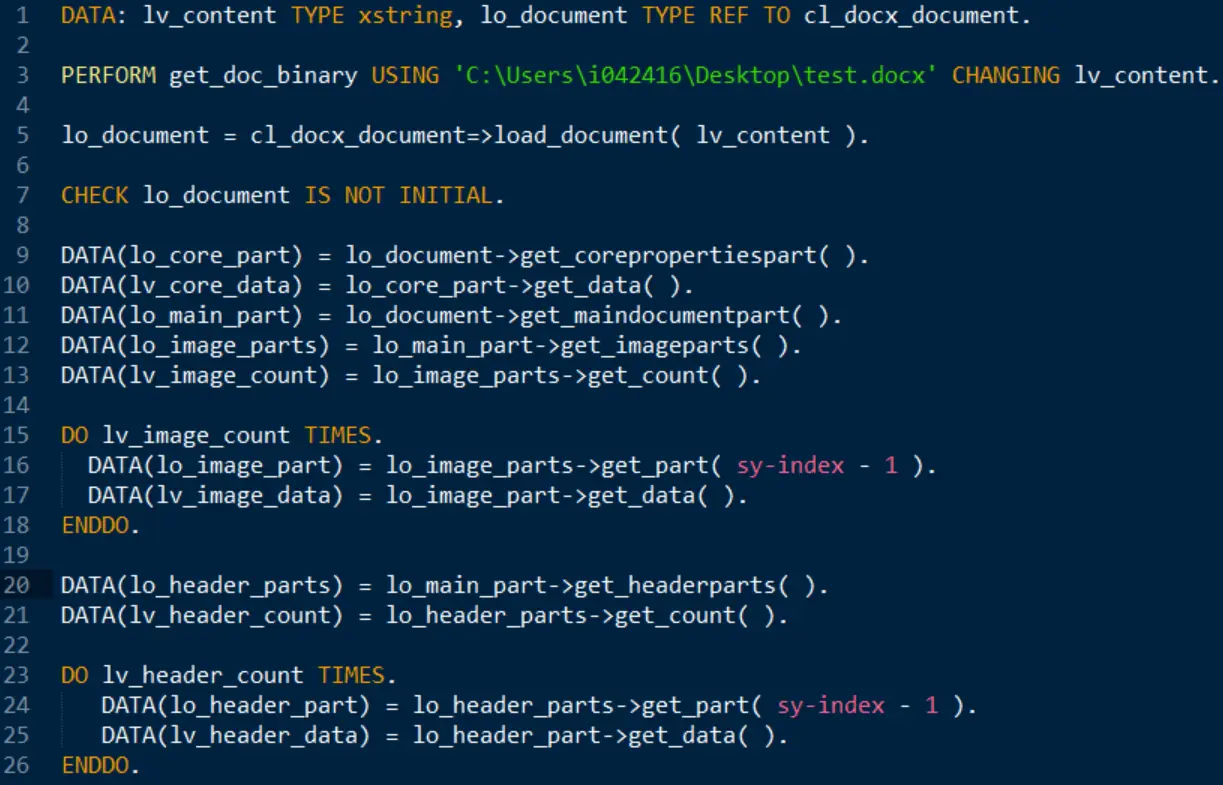 (1) 将word文档的二进制内容传入方法cl_docx_document=>load_document,得到一个文档对象引用,然后就可以借助该对象引用调用各种方法了。