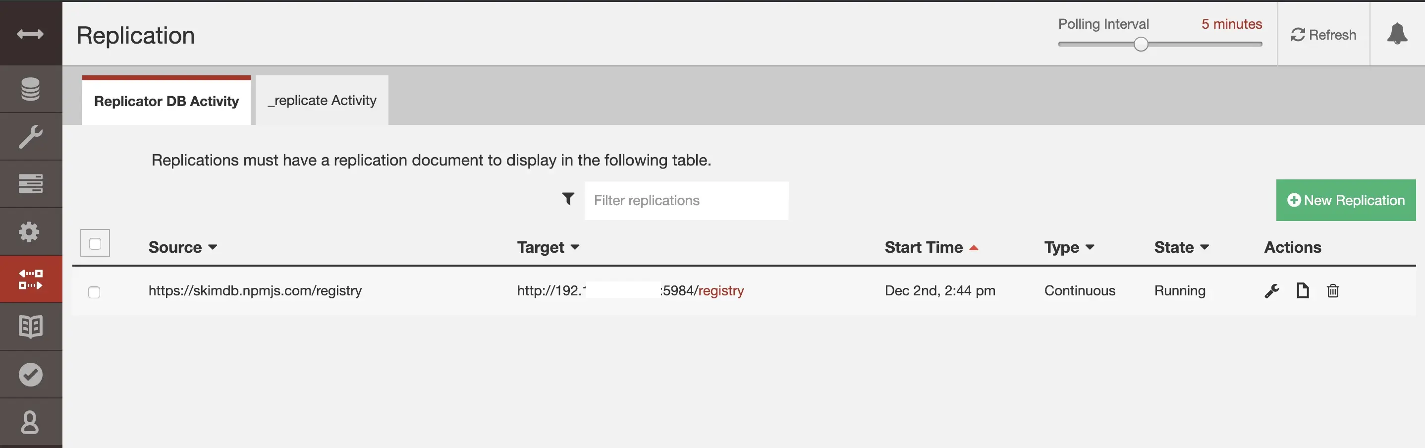 会遇到问题的地方上面都过了一遍,在couchdb的web管理界面http://localhost:5984/_utils/#/replication进行同步操作,记得勾选连续Continuous而不是一次性One time,让脚本不停的跑,由于数据量大,同步镜像需要很长时间。