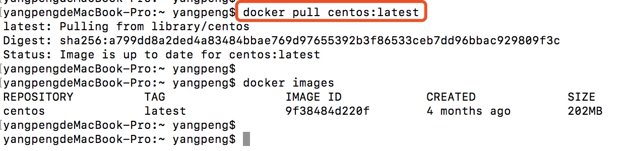 上面是使用pull子命令从DockerHub下载centos:latest镜像,其中centos是镜像名,latest是标签名。使用docker images命令已经可以看到刚下载的centos镜像了。
