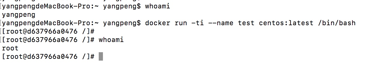 run命令启动一个容器(注意容器启动前后的whoami输出以及终端提示符的变化)。