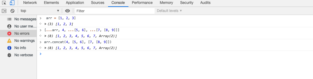 console.log([...arr, 4, ...[5, 6], ...[7, [8, 9]]]) // [ 1, 2, 3, 4, 5, 6, 7, [ 8, 9 ] ]