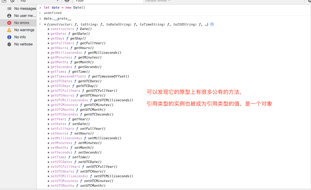 这里通过 new 关键字来生成一个 Date 引用类型的实例,可以发现它的原型上有很多公有的方法,引用类型 的实例也被成为引用类型的值,是一个对象