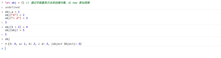 console.log(obj) // {"3": 4, "a": 1, "b": 2, "c d": 3, "[object Object]": 5}