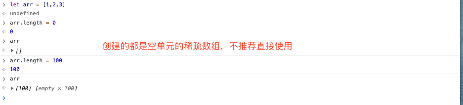 console.log(arr) // [ <100 empty items> ] 创建的都是空单元的稀疏数组,不推荐直接使用