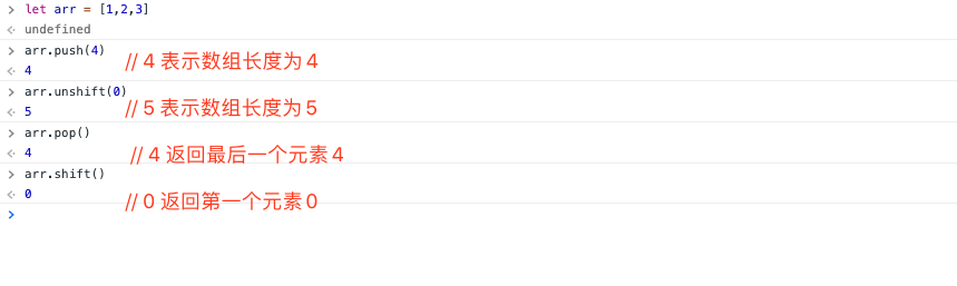 console.log(arr.unshift(0)) // 5 表示数组长度为5
