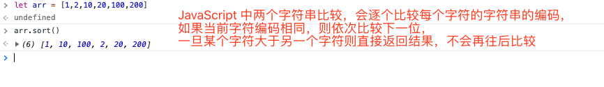 调用 sort 会将每个元素都转为字符串,最终会给 "1", "2", "10", "20""10", "20", "100", "200" 排序,而在上一章中我介绍到,JavaScript 中两个字符串比较,会逐个比较每个字符的字符编码,如果当前字符编码相同,则依次比较下一位,一旦某个字符大于另一个字符则直接返回结果,不会再往后比较