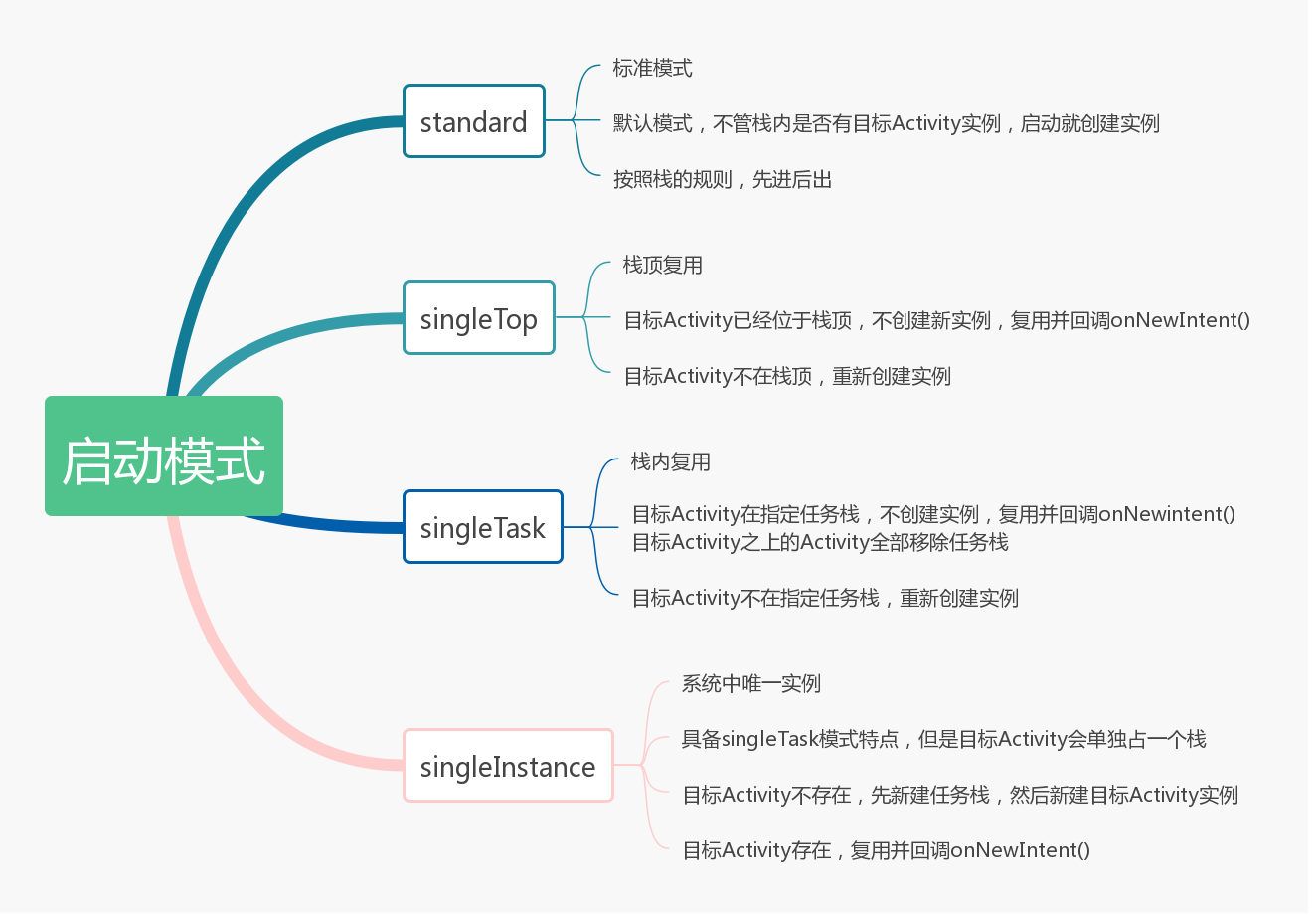 - singleTop模式用taskAffinity结合Intent.FLAG_ACTIVITY_NEW_TASK可开启新的Task