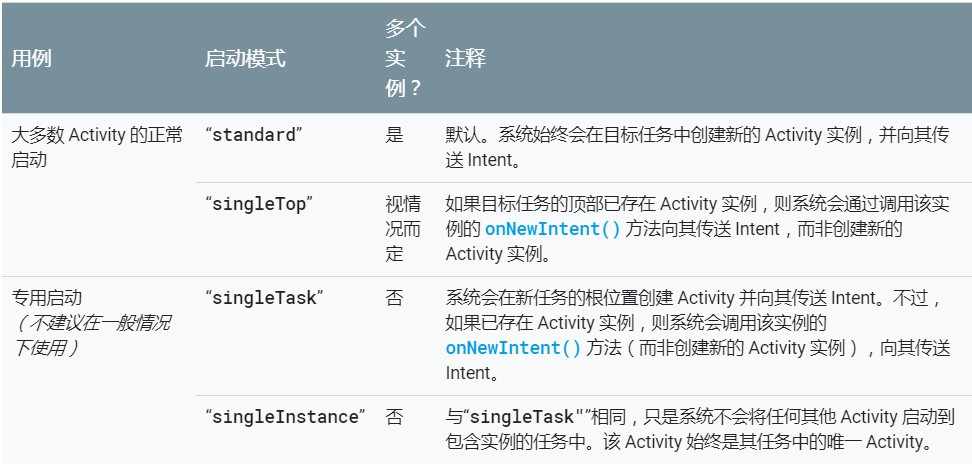 系统会在新Task的根位置创建 Activity 并向其发送 Intent。不过,如果已存在 Activity 实例,则系统会调用该实例的 onNewIntent() 方法(而非创建新的 Activity 实例),并向其发送 Intent。