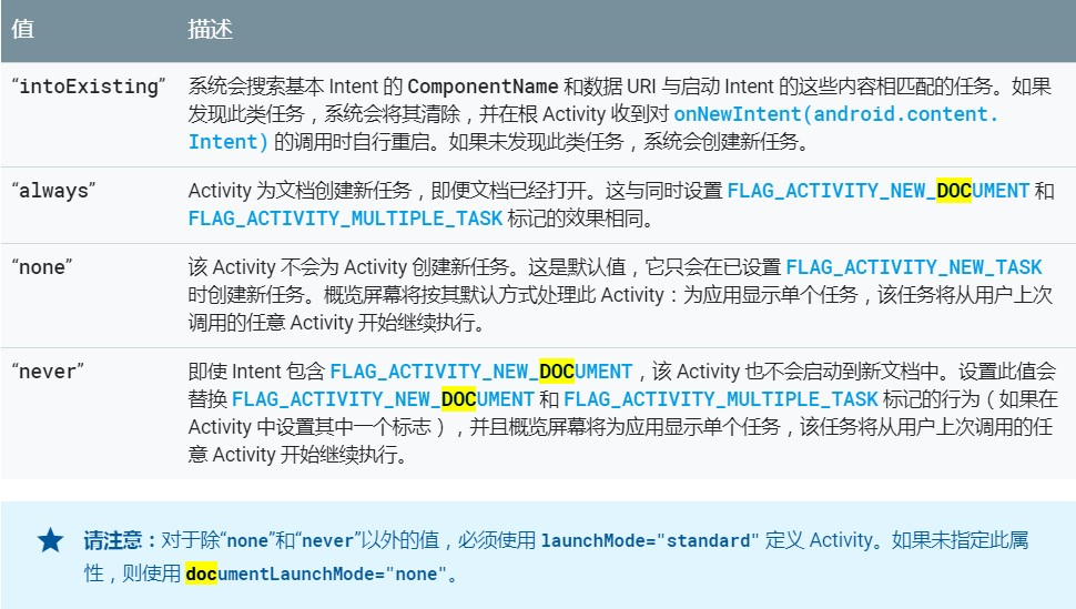 最最后,再来扒扒概览屏幕(最新动态屏幕、最近任务列表或最近使用的应用),documentLaunchMode指定每次启动任务时,如何向其添加新的Activity实例,该属性允许用户让多个来自同一应用的文档出现在概览屏幕中。用户可以浏览该列表并选择要恢复的任务,也可以通过滑动清除任务将其从列表中移除。 对于 Android5.0版本(API级别21),documentLaunchMode不同,同一Activity的多个实例可能会以任务的形式显示在概览屏幕中。 它有四个属性值,看下下面的图表: