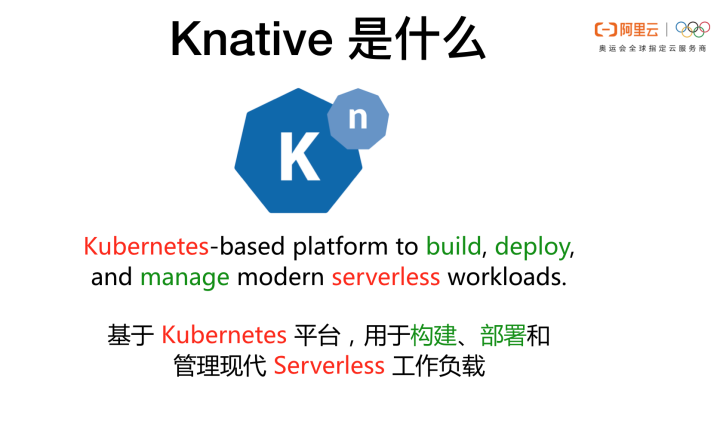我们先看看官方给出的定义:“基于 Kubernetes 平台,用于构建、部署和管理现代 Serverless 工作负载”。Knative 就是基于 Kubernetes 的应用 Serverless 编排系统。实际上 Knative 包含的不单单是 Workload,它还有 Kubernetes 原生的流程编排引擎和完备的事件系统。