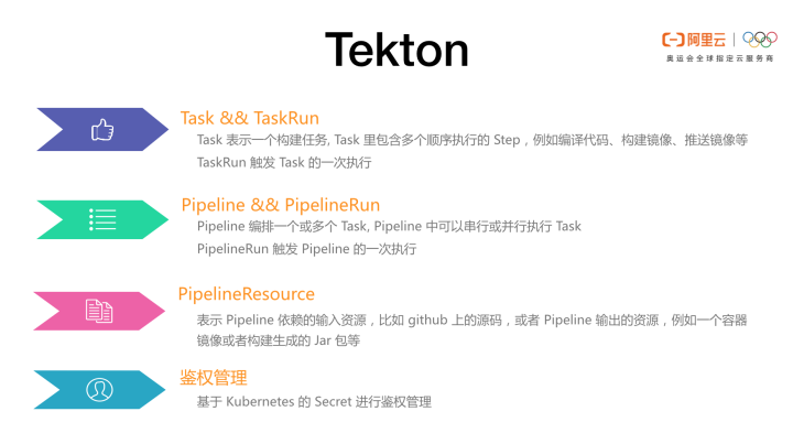 - Tekton 是 Kubernetes 原生的实现,所以资源鉴权的秘钥等信息都可以通过 Kubernetes 的 Secret 进行管理。