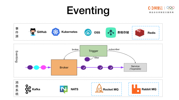 Eventing 有很强的扩展机制,可以接入任何外部事件源的事件,比如 github 里面的 commit、pull request 等事件;Kubernetes 里面的事件;消息系统里面的消息;以及 OSS、表格存储、Redis 等系统的事件。