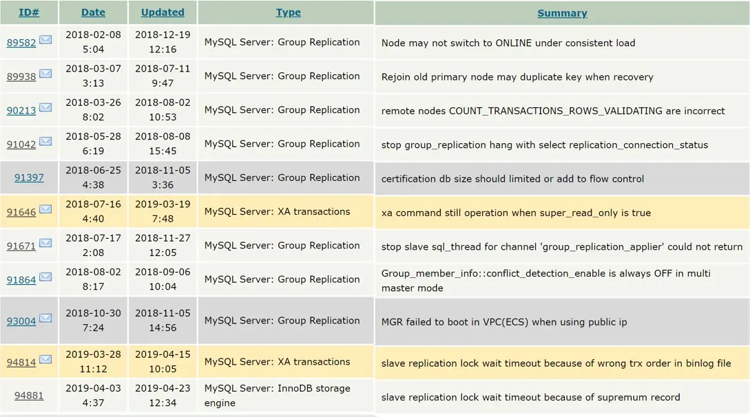 正因为如此,温正湖选择尽可能多跟MySQL社区互动,包括反馈bug并提供修复patch。近两年,温正湖团队已经累计向MySQL和Percona反馈了数十个bug,其中向MySQL提的bug主要跟MGR、XA事务和主从复制相关,向Percona提的bug主要跟MyRocks、SQL审计相关。