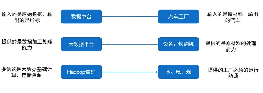 从 Hadoop 集群的开发运维,到构建大数据平台,再到数据中台建设,这是很多大型互联网公司大数据的建设历程。到底什么是数据中台,数据中台跟我们之前一直说的大数据平台有什么区别,我想可以通过一个例子来说明。如果我们把数据中台看作是一个汽车工厂,那大数据平台就是工厂中的设备,Hadoop 集群则是工厂运作所必须的水、电、煤。Hadoop 提供的是大数据生产所必须的计算和存储资源,大数据平台使得数据开发人员具备了对数据的加工和处理能力,类比设备使得工人具备了对原材料的加工能力,但是大数据平台还不能提供产品,这么多的原始数据,要按照一定的方法论,进行良好的组织,加工,才能生成最终的指标,就如只有切割机、油漆机还不能生产汽车,各个零部件要按照一定的规则,通过设备组装在一起,才是一辆完整的汽车。